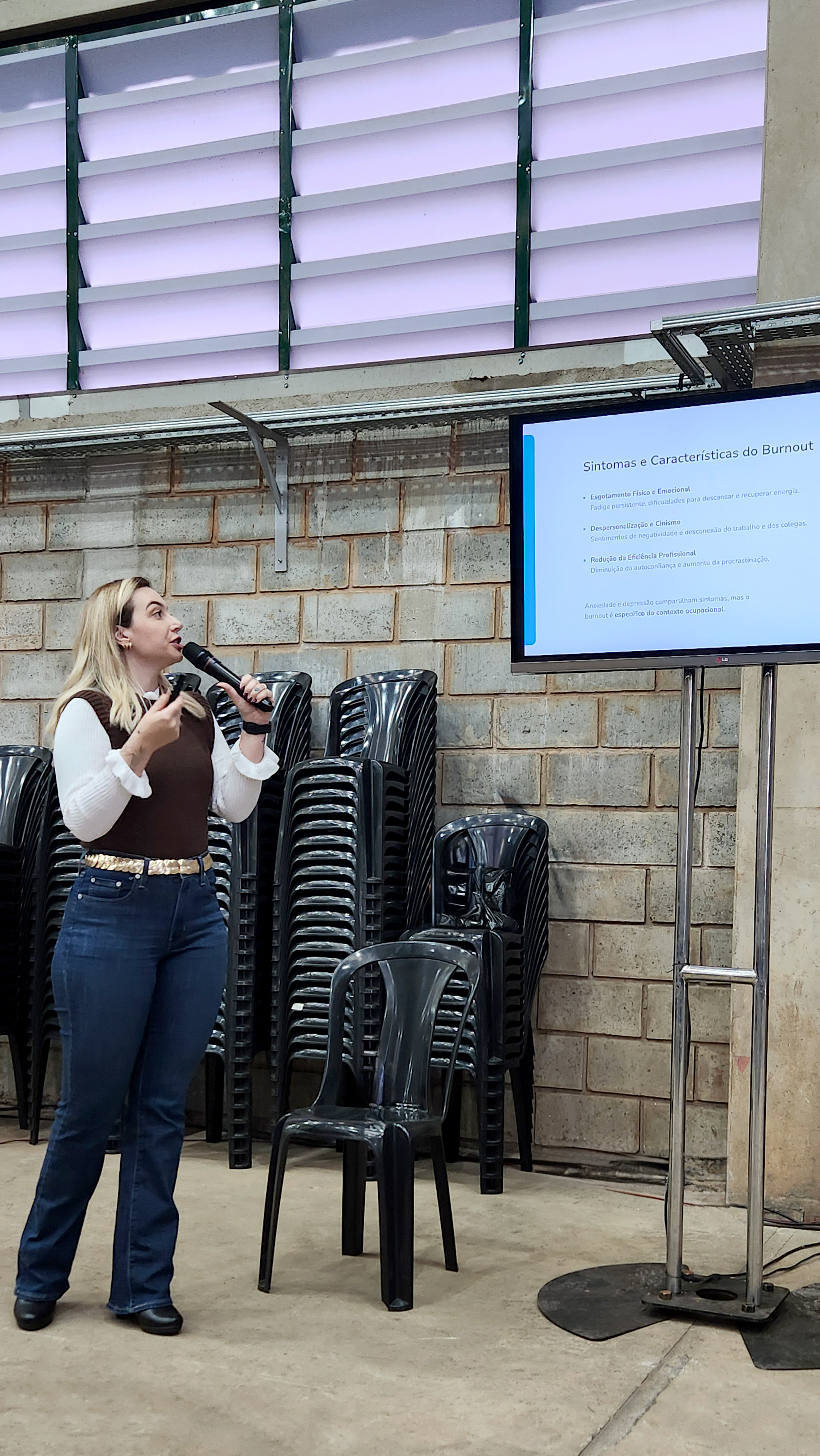 A psicóloga Letícia Sinibaldi abriu o evento com uma palestra sobre a Síndrome de Burnout, um esgotamento físico e emocional causado pelo excesso de trabalho.