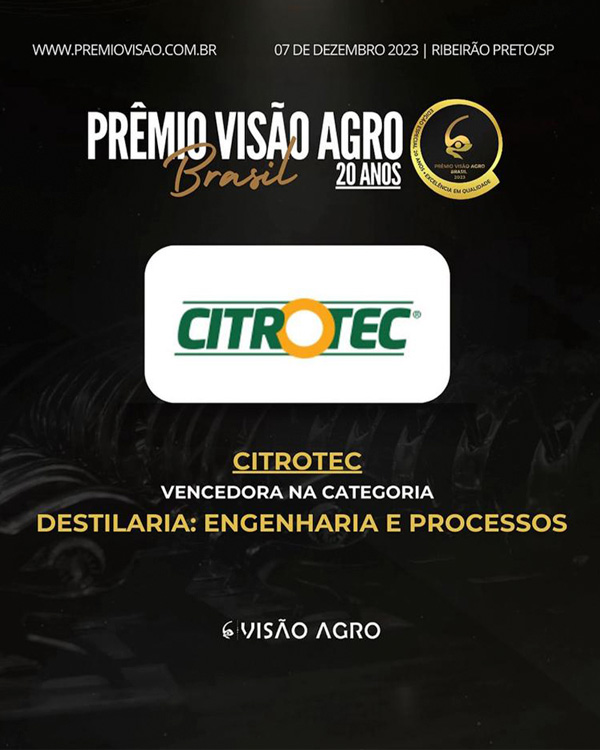 A Citrotec® foi destaque na 20ª edição do Prêmio Visão Agro Brasil, que ocorreu em 07 de dezembro, em Ribeirão Preto (SP). A empresa venceu na categoria “Destilaria: Engenharia e Processos”.