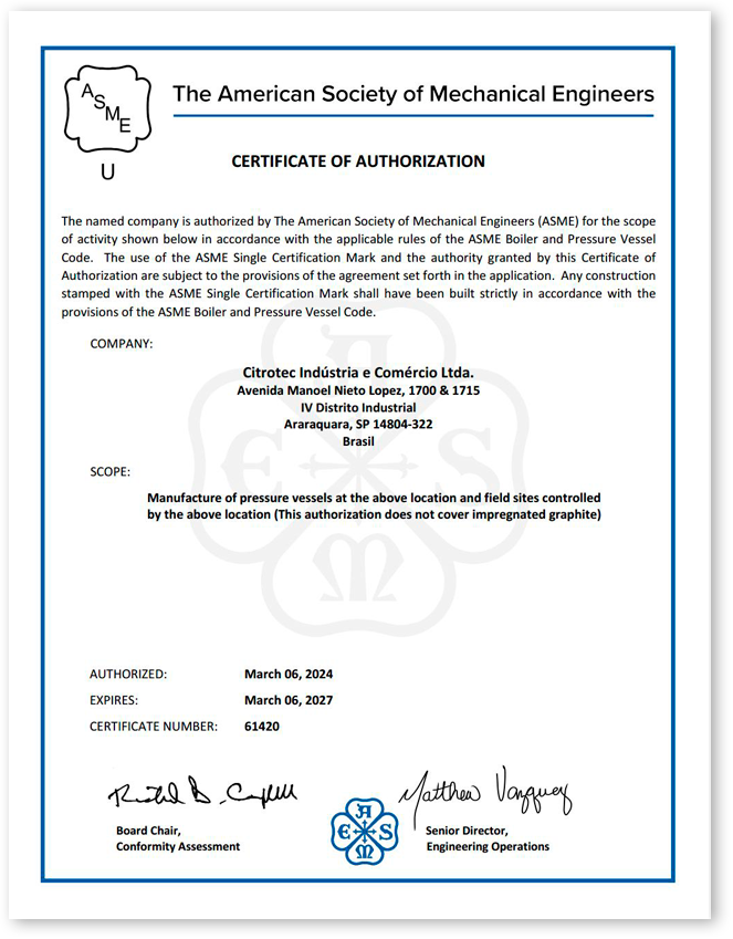 Citrotec® has received the ASME Certification, the most widely used reference standard worldwide for the production of pressure equipment. The seal is required by 140 countries for the commercialization of products such as boilers, pressure vessels, high-pressure pipelines, and safety valves, among others.