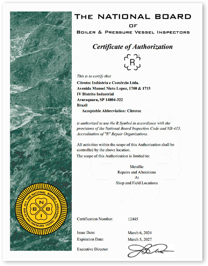 We also rely on LRQA - ASME Authorized Inspection Agency to inspect and oversee all projects," highlights Marques. In Brazil, Citrotec is the 60th company to achieve certification. "We are very proud of this new achievement," says Citrotec's® Technical Director, Paulo Sampaio.