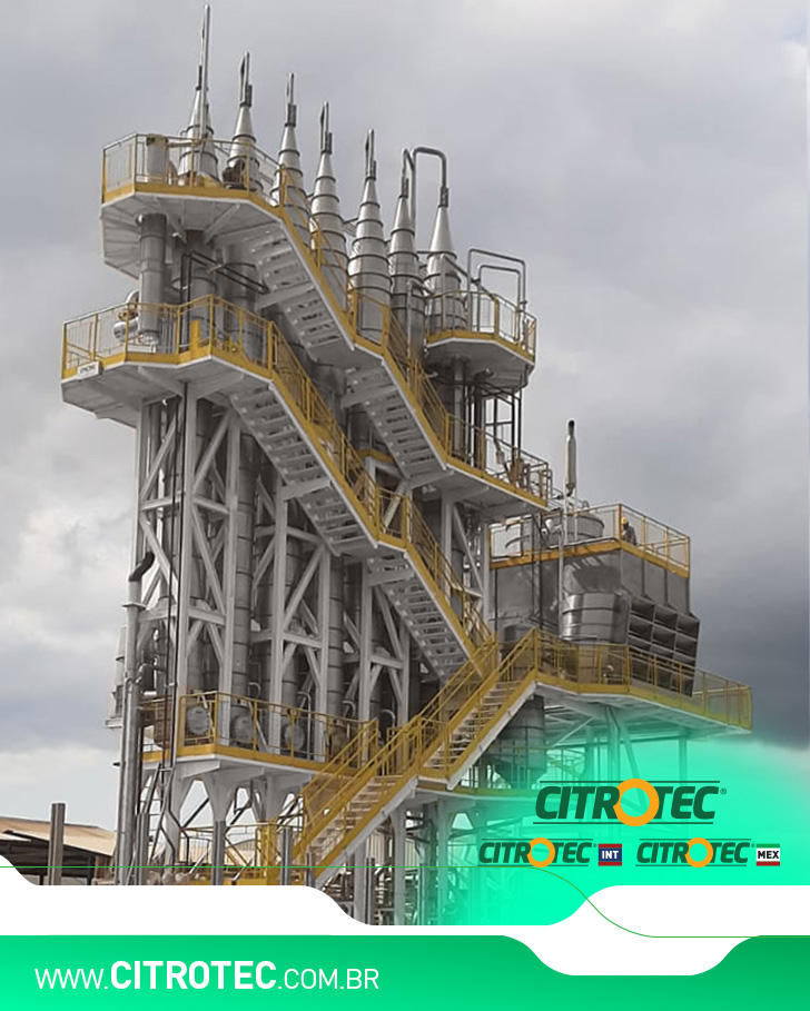The assembled Evaporator was 100% designed and manufactured by Citrotec® and exported to Mexico. The equipment was installed in the city of Tecoman and will start its activities in May of this year. The ENET® Evaporator has an evaporation capacity of 45,000 kg/h, with 7 effects and 7 stages. It has optional equipment such as an evaporative condenser and aroma recovery to remove d-limonene, a high-value-added product.