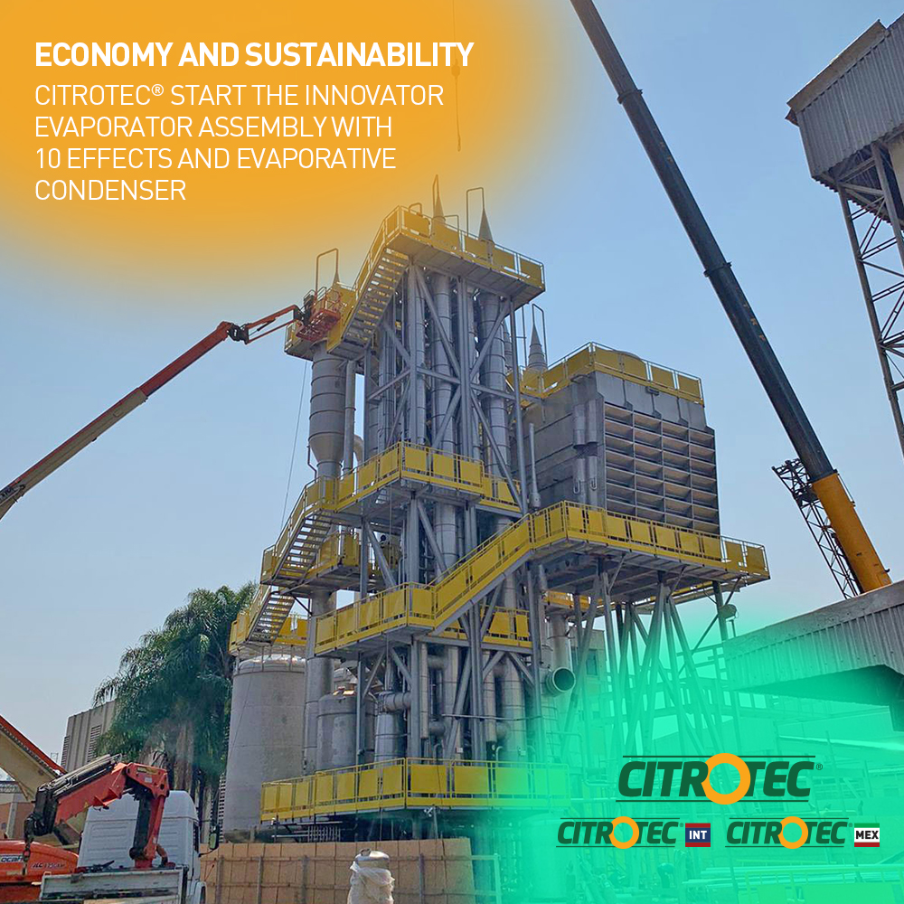 Our first TASTE® Evaporator with 10 effects of evaporation, with this technology we will have the most economical TASTE® Evaporator has already built, with capacity od 55.000 kg/h of evaporation, the equipment will be used in the base pectin productions process with the goal of recovery citrus oil and recycle the washer water used in the peel wash process, become the process self-sustaining, by the low water consumption with “zero” effluent emission, beyond the generating revenue in the oil recovery.