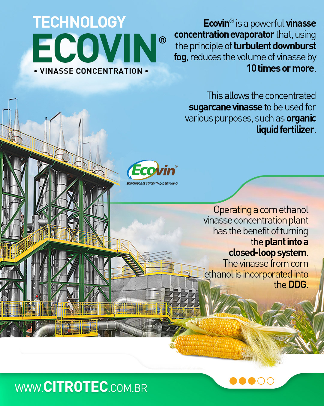 Ecovin JL®, on the other hand, had its project developed in a partnership between Citrotec® and ETECH, of the distillery scientist Jaime Lacerda, an icon in the sugar-energy sector. Potent evaporator of concentration of vinasse, Ecovin JL® is a concentration system that, using the principle of descending turbulent mist and coupled to the distillation columns, allows the production of alcohol with the vinasse already concentrated, without additional consumption of steam. Ecovin JL®, maintains continuous improvements in partnership with ETECH. Its system of concentration of vinasse for corn, also uses the principle of descending turbulent mist, coupled to ETECH distillation columns, to produce corn ethanol with concentrated vinasse without additional steam consumption. Corn vinasse is incorporated into the DDG.