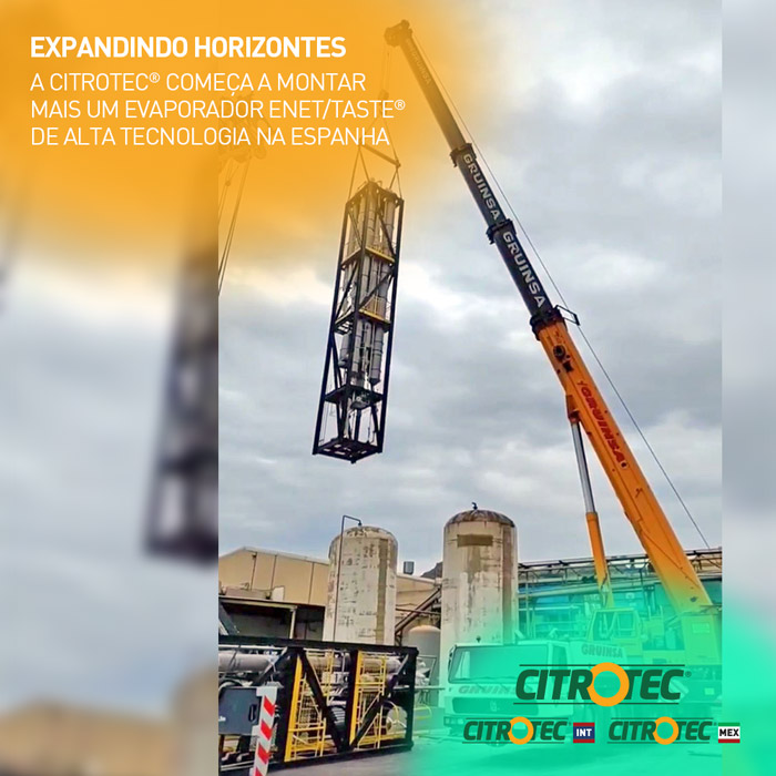 O equipamento foi entregue em julho e a montagem está a todo vapor para iniciar as operações no final de outubro. “Para isso, nosso time está trabalhando para que mais uma tecnologia Citrotec®, agora o Evaporador ENET/TASTE® , seja um sucesso e conhecido no mundo todo. Dessa vez, iremos deixar nossa marca na Europa, na Espanha”, ressalta o diretor técnico da Citrotec®, Paulo Henrique Sampaio.