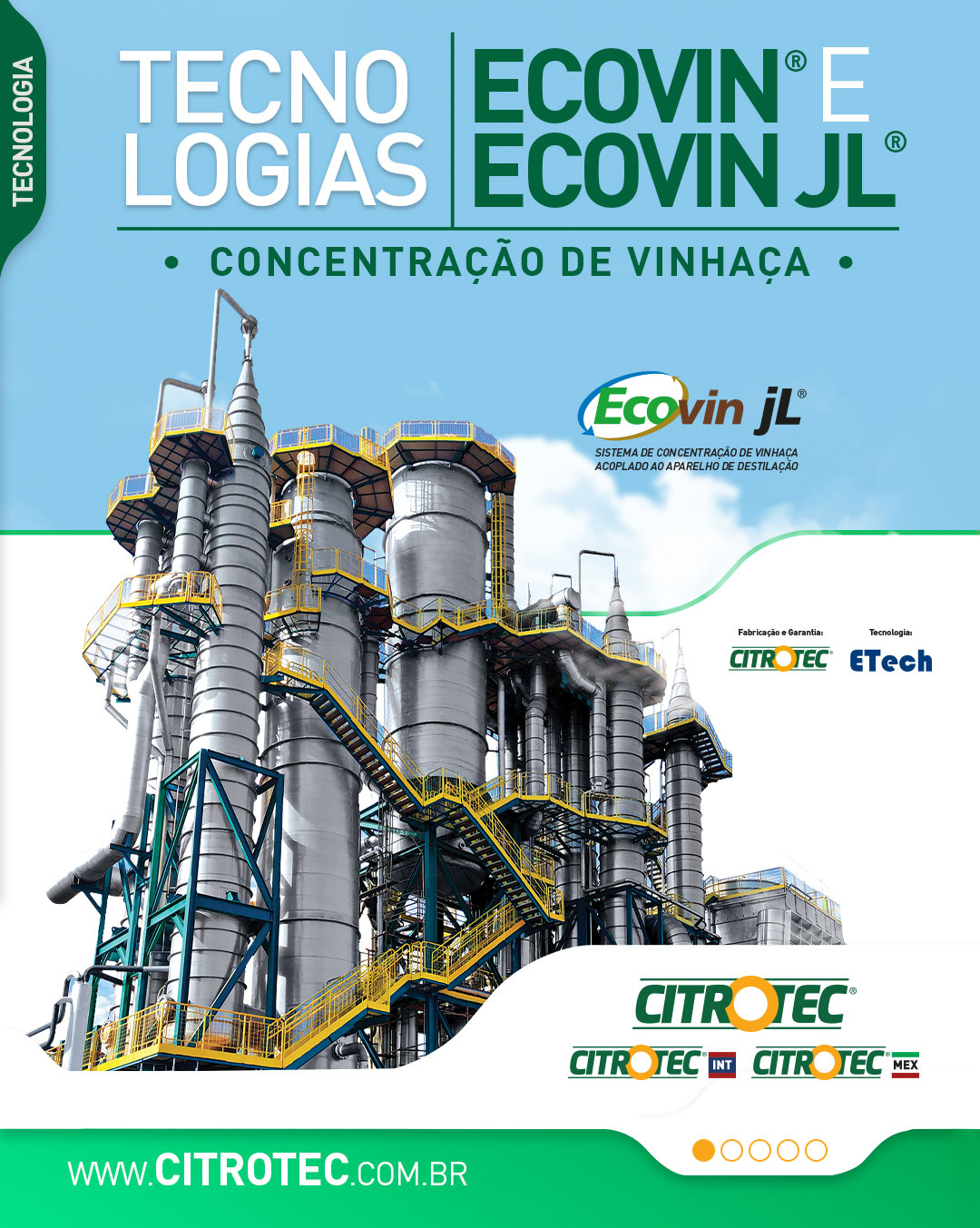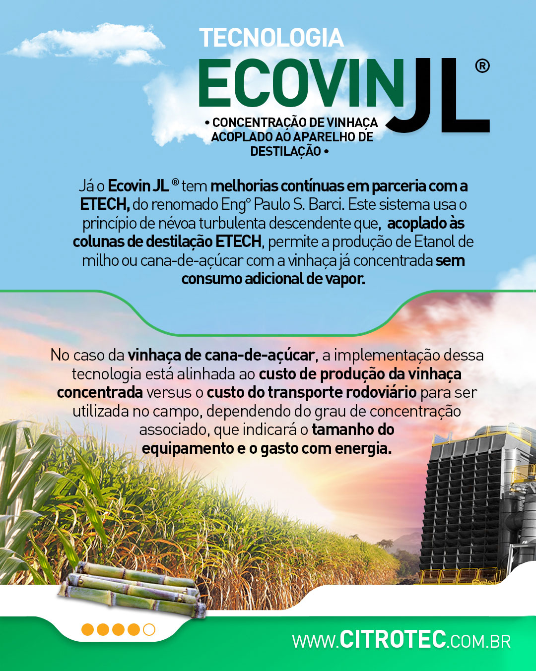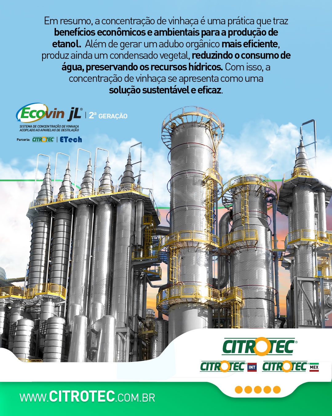 Já o Ecovin JL®, teve seu projeto desenvolvido em parceria entre a Citrotec®, o cientista em destilarias Jaime Lacerda, um ícone no setor sucroenergético e mantém contínuas melhorias, chegando em sua segunda geração de desenvolvimento em parceria com a ETECH, do também renomado Engenheiro Paulo S. Barci. Potente evaporador de concentração de vinhaça, o Ecovin JL® é um sistema de concentração de vinhaça que, utilizando o princípio de névoa turbulenta descendente e acoplado às colunas de destilação, permite a produção de álcool com a vinhaça já concentrada, sem consumo adicional de vapor.