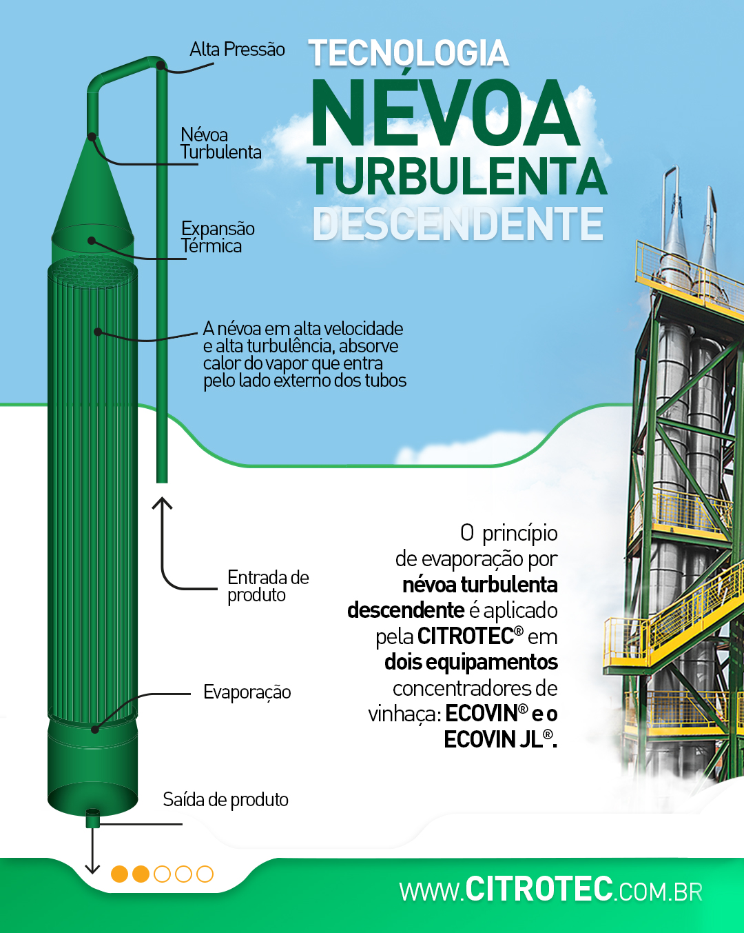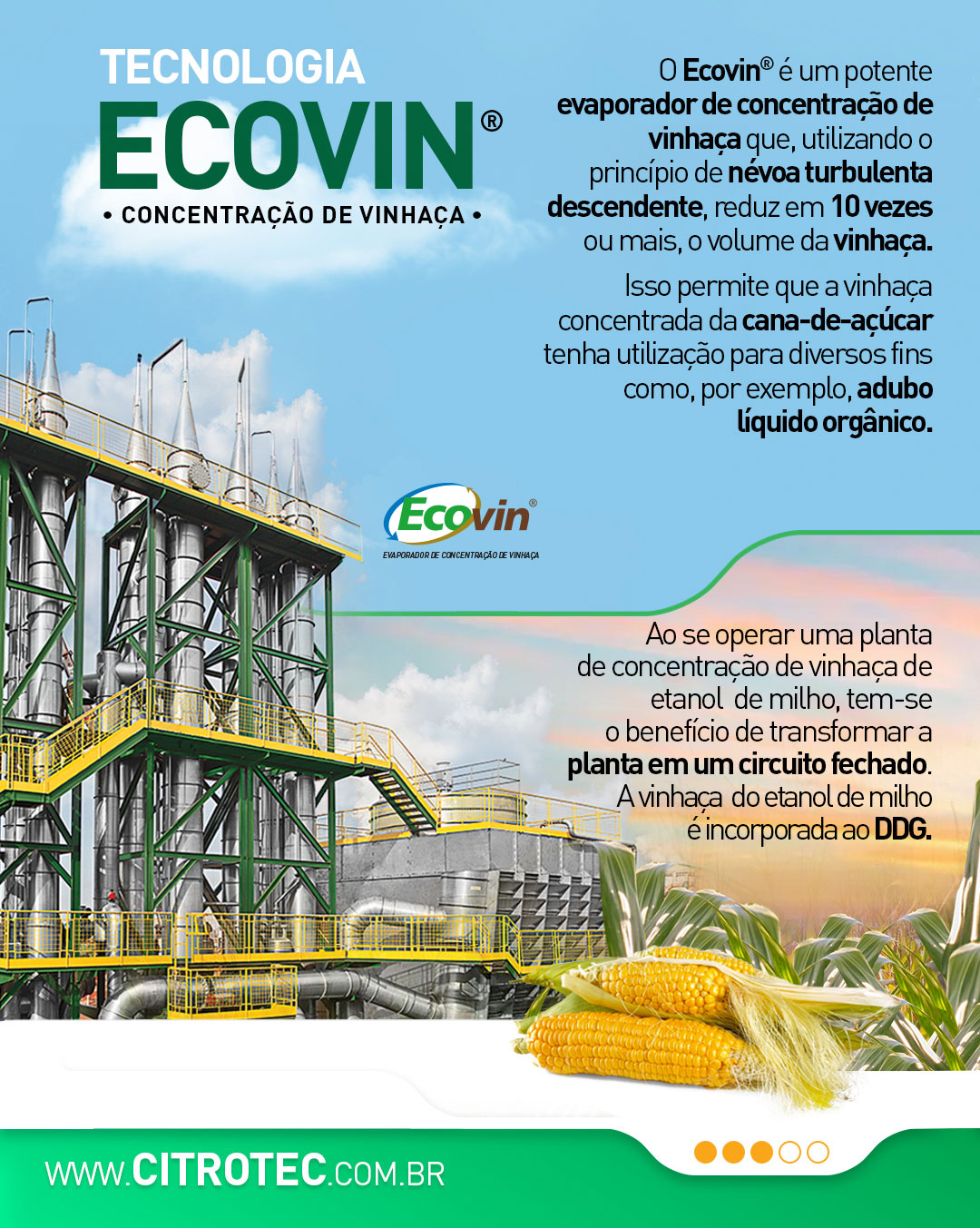 Conheça os equipamentos Ecovin® e Ecovin JL®, desenvolvidos pela Citrotec® para concentração de vinhaça no caso do Ecovin® e concentração de vinhaça com produção de etanol com o Ecovin JL®.